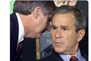 该图片中,时任前白宫办公厅主任安德鲁-卡德告知时任美国总统小布什:“先生,第二架飞机撞上了二号大楼。”