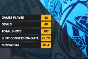 Opta统计了哈兰德在英超主场比赛的进球数据,他出战48场英超主场比赛,打进48球,而英超历史唯一在少于50场主场比赛中打进50球的是希勒,他只用了47场比赛。