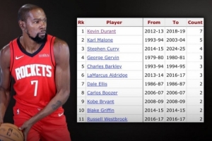 杜兰特在休斯敦对阵火箭季后赛​共7次​砍下30+ 为历史最多