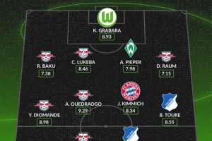 中场:扬-迪奥曼德(莱比锡,8.98分)、韦德拉奥果(莱比锡,9.29分)、基米希(拜仁慕尼黑,8.34分)、巴祖马纳-图雷(霍芬海姆,8.55分)