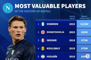 体育资讯10月28日讯 德国转会市场统计了那不勒斯队史的身价前10球员,奥斯梅恩位列第一。